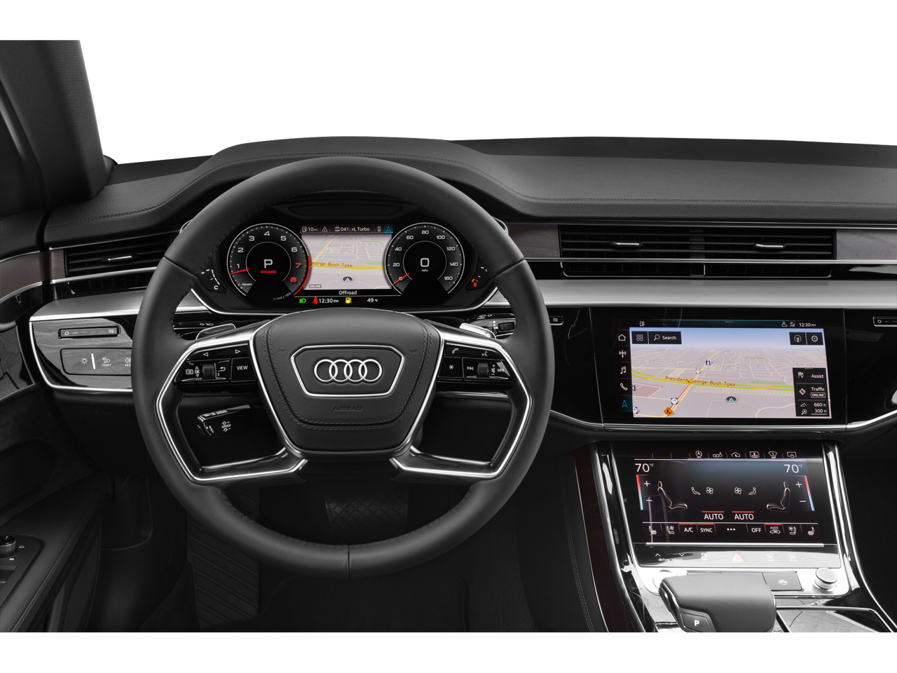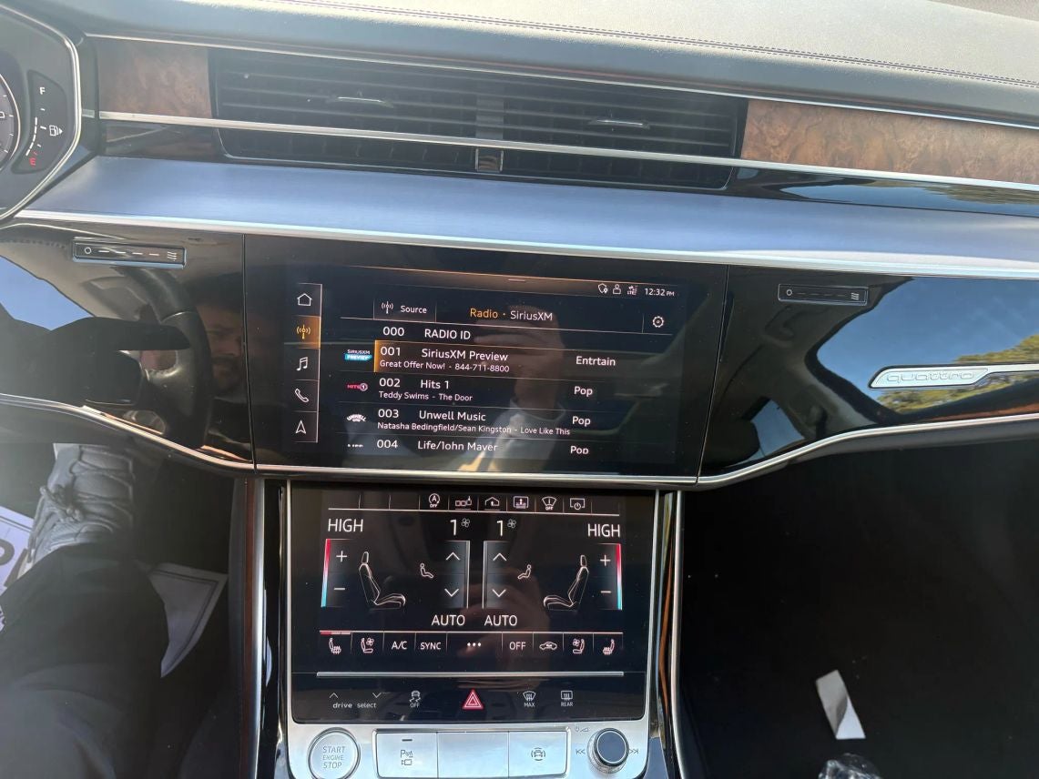 - Radio: MMI Navigation Plus -inc: natural voice control system, MMI touch response w/dual-center displays (10.1-inch upper and 8.6-inch lower) and haptic feedback, limited-time subscription to Audi connect CARE assistance and security services, 6-month trial subscription to Audi Connect PRIME and Audi connect PLUS online services, Audi smartphone interface including Apple CarPlay and Google Android Auto for compatible devices, Alexa integration, HD Radio technology, SiriusXM all access service w/3-month trial subscription, Audi music interface w/front USB ports for data/charting and two USB ports for charging, Bluetooth® streaming audio for compatible devices, Bluetooth® wireless technology preparation for compatible devices